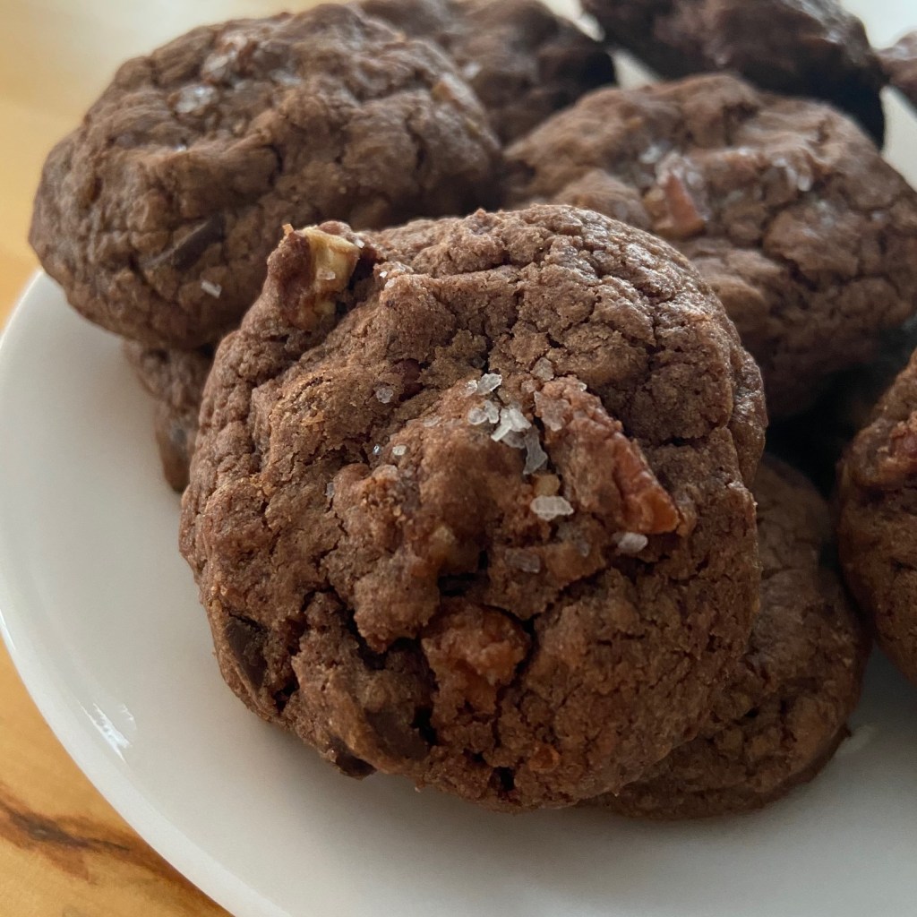 Combine the dry ingredients: Salt, cocoa powder, baking powder, and flour. Then sift this mixture into the wet ingredients. Stir to combine, and fold in the chocolate chips and pecans once the wet and dry ingredients are combined. (This is not a wet dough!)