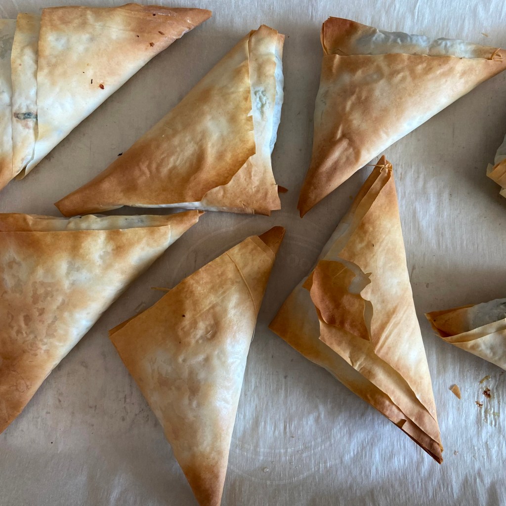 Cut the dough vertically into 3 inch wide strips. Place 1 1/2 teaspoons of filling on one end of the dough strip. Fold one corner of the dough over the filling to make a triangle shape. Keep folding until you reach the end of the strip of phyllo. Brush a bit of melted butter over the top of the triangle and place it on the prepared cookie sheet. Then repeat the process with the remaining dough and filling.