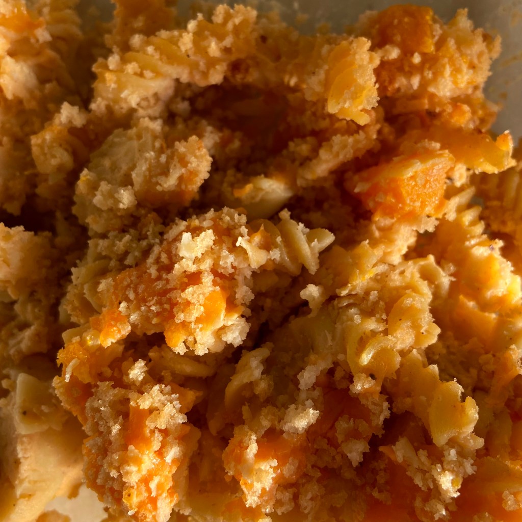 Add 1 1/2 cups of the cheddar and the gruyère and stir until melted. Add the cooked macaroni and roasted squash. Stir to combine, and then transfer to a 9 by 12 baking dish.